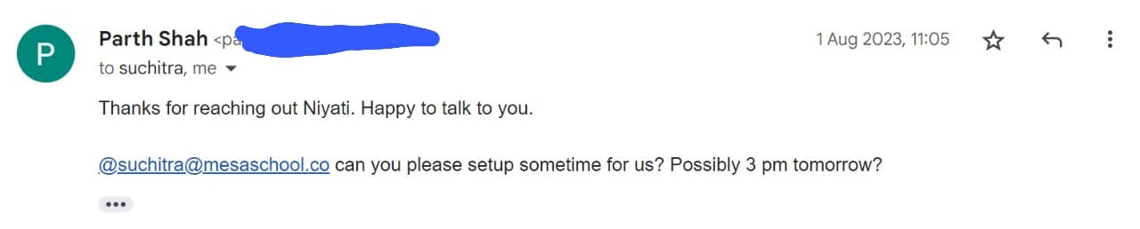 Reference: My own network. I had met Aniruddh (Lead Founder’s office) in an event when I was working on Stellars and had his number saved which helped me get through the entire conversation.