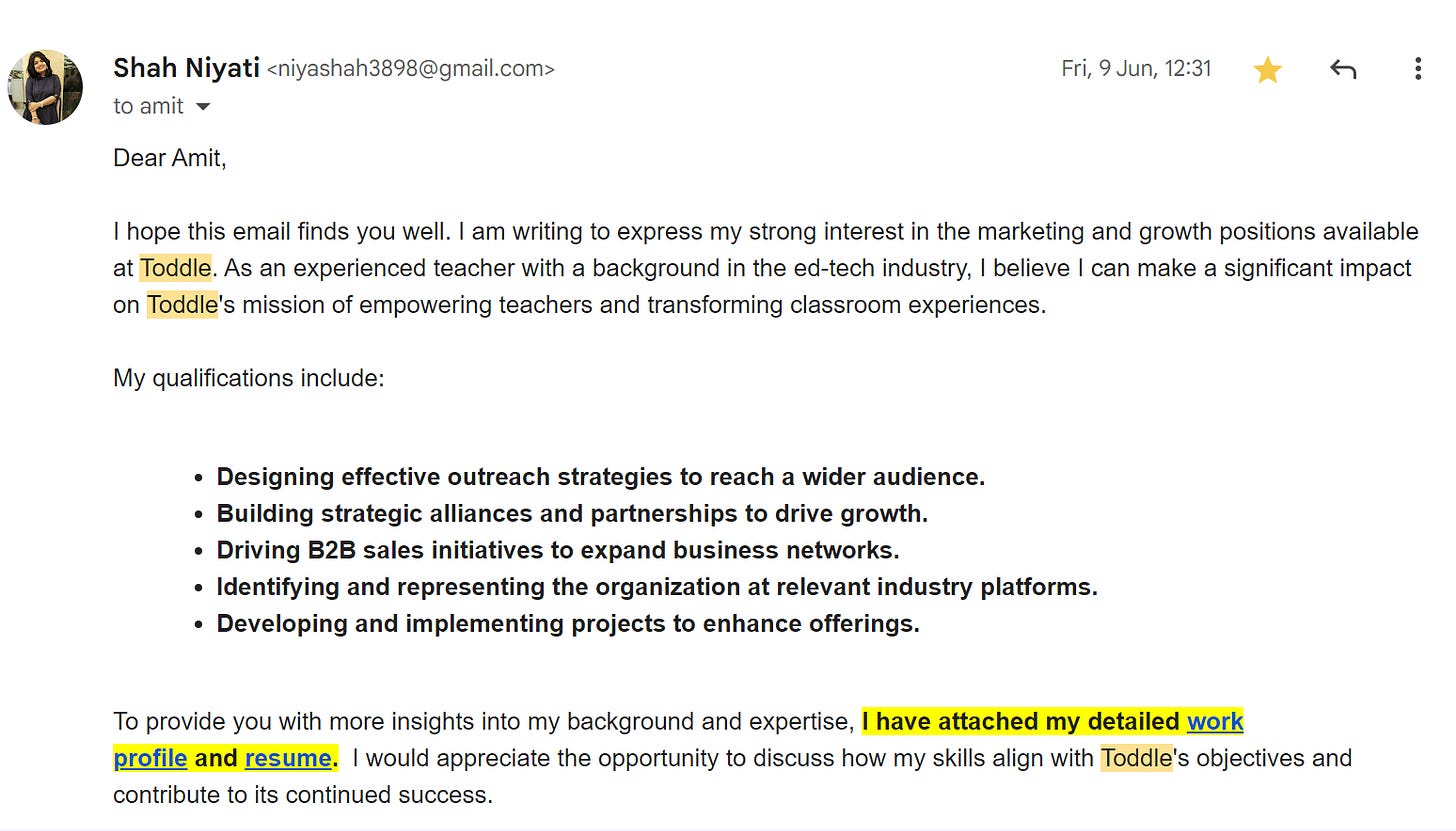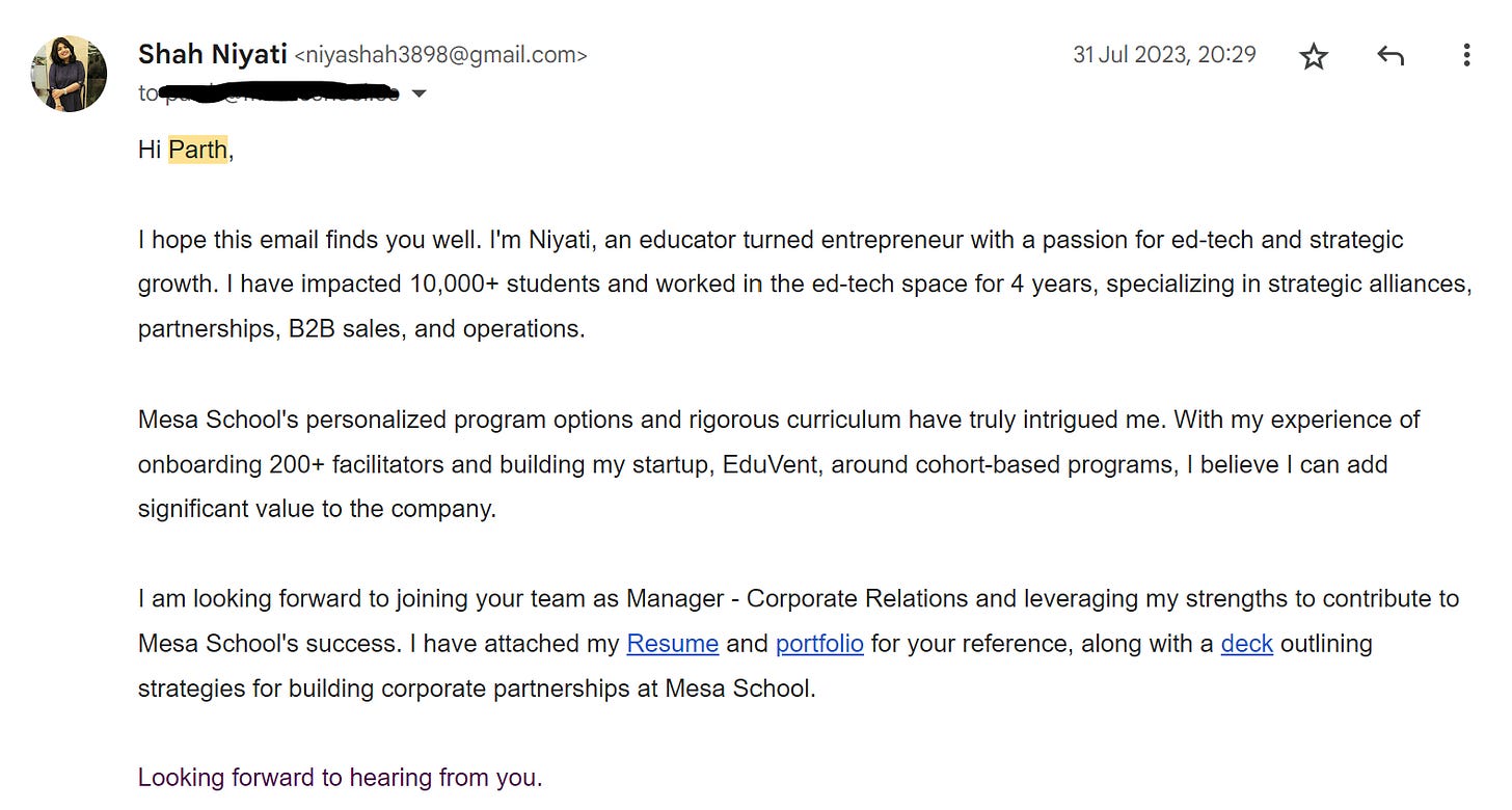 Throughout my journey, one lesson stood out: the undeniable power of proof of work. It's the key to standing out in a crowded field. I have secured countless opportunities thanks to solid proof of work. Even at Toddle, I shared my work without being prompted, further solidifying my credibility. My dedication to this approach fostered strong relationships with the companies I applied to, even when things didn't align for various reasons. My proof of work consistently made a strong first impression and ensured prompt responses to my cold emails.