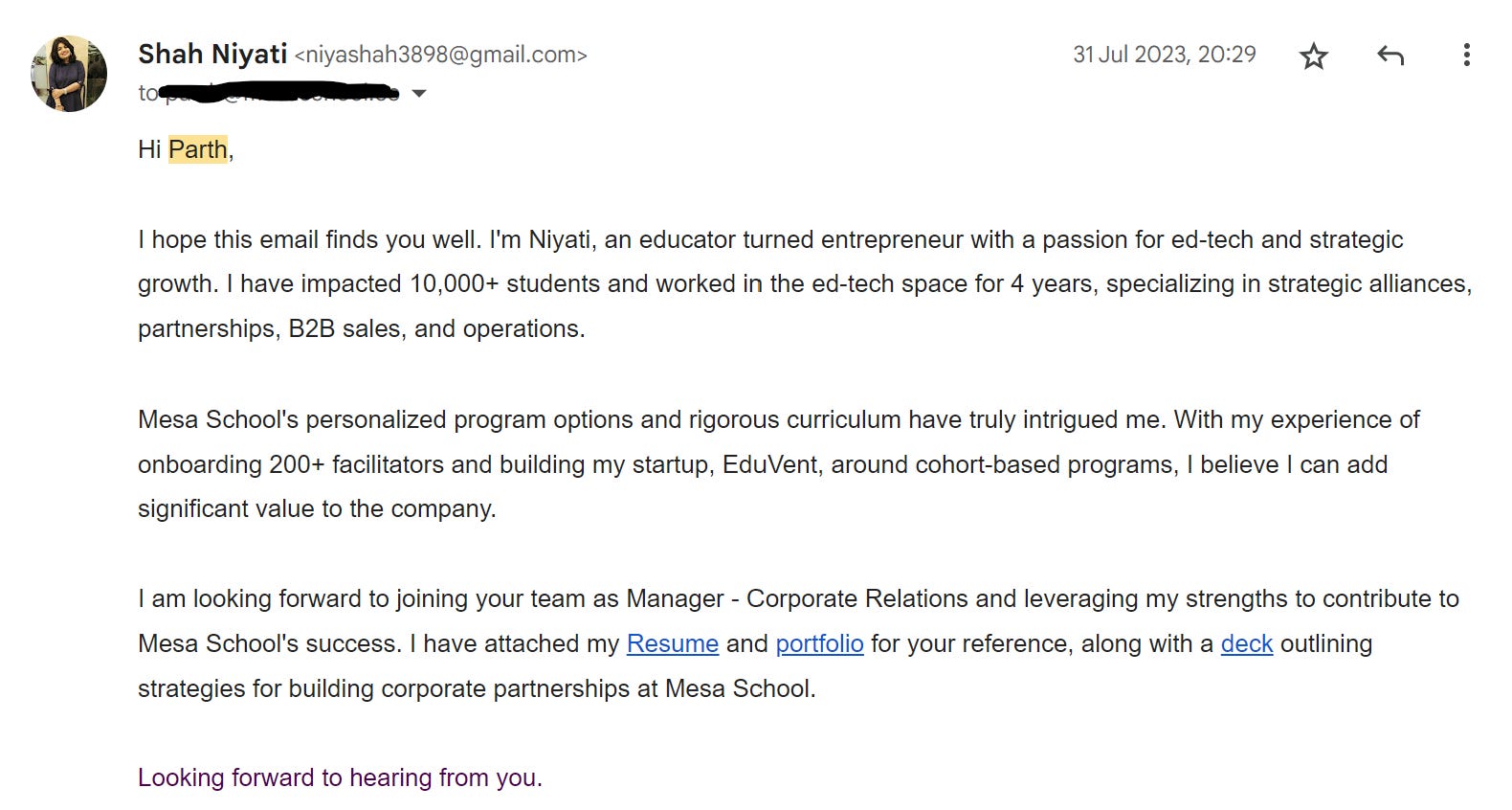 The cold email draft got me quick responses from the recruiters.