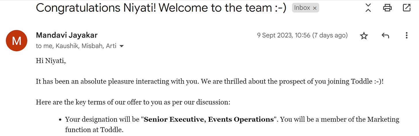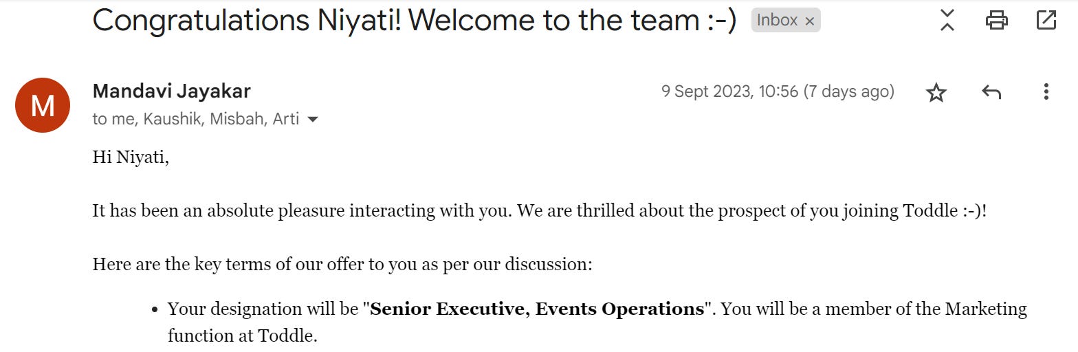 Cut to 3 months, here I am with the final offer letter from Toddle ticking off all the criteria I had in mind for my dream job.